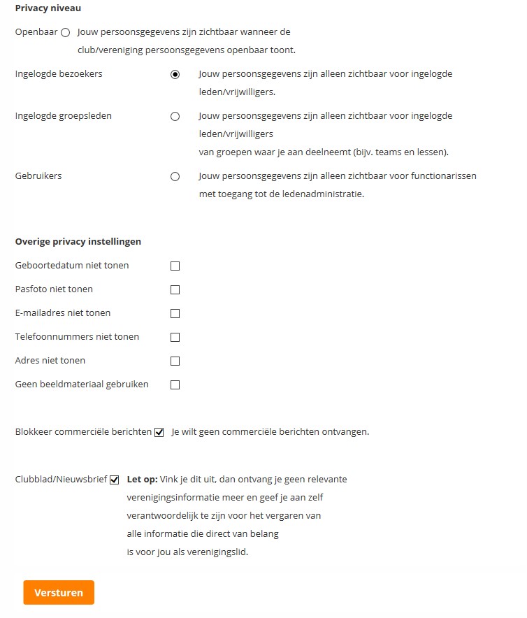 Klik nu bovenin op de knop ‘Privacy instellingen’. Als je nu naar beneden scrolt zie je daar een overzicht met geheime gegevens. Je kunt hier aanvinken welke gegevens je niet zichtbaar wilt hebben in de ClubApp. Klik daarna op versturen. De ledenadministratie van Bequick moet de wijziging nog in het systeem accorderen. Het kan dus een paar dagen duren voordat het verwerkt is.